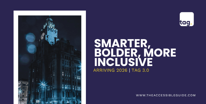 Accessibility isn’t static — it changes every day. That’s why The Accessible Guide will be introducing TAG 3.0 in 2026, a platform designed to make inclusion easier to trust, easier to share, and easier to act on. For businesses, that means new opportunities to build trust, reputation, and loyalty every day.